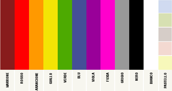marrone - rosso - arancione - giallo - verde - blu - viola - fuxia - grigio - nero - bianco - pastello