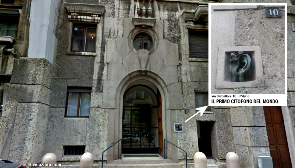 Che cos’è un citofono se non un grande orecchio da cui i padroni di casa ascoltano i suoni della strada? Deve essere quello che ha pensato Adolfo Wildt, scultore dell’inizio del Novecento, quando nel 1930 gli fu chiesto di realizzare una scultura funzionale a farsi annunciare a palazzo Sola Busca, in via Serbelloni 10 a Milano, nel famoso Quadrilatero del Silenzio.