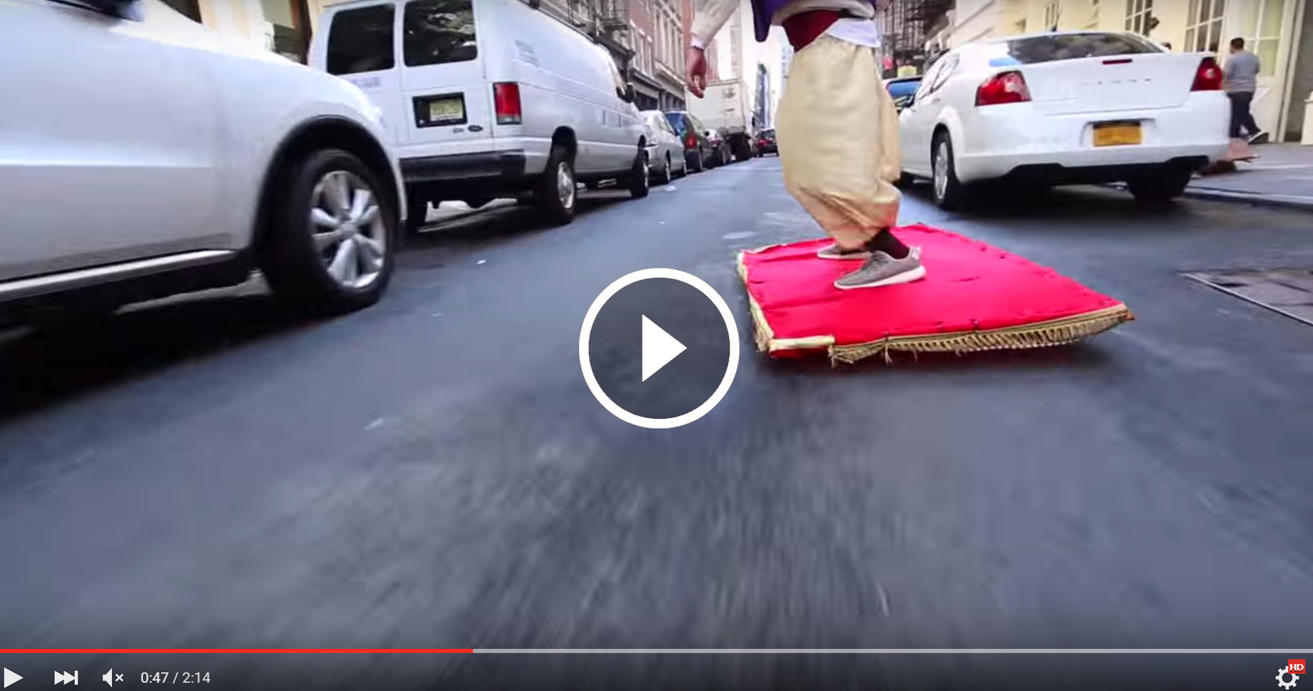 Per le strade di New York è spuntato un moderno Aladino. Munito di monopattino addobbato a tappeto volante, l’uomo se ne va in giro vestito come il mitico personaggio e sembra divertire molto i passanti allibiti!
