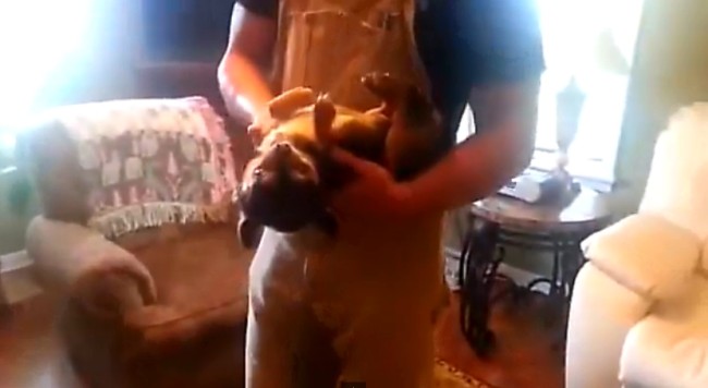 Il cane è spaventato a morte dal figlio del suo padrone, e se lo prende in braccio guardate cosa fa