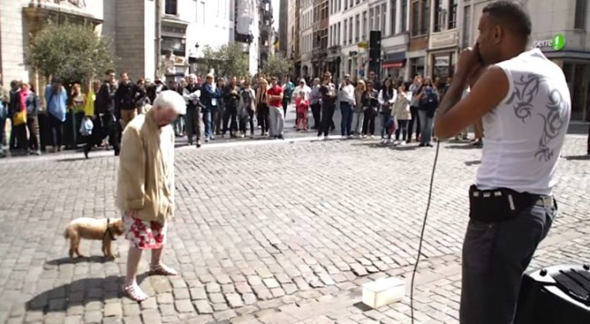 Quando questo performer ha visto avvicinarsi una signora con il cane lungo una strada di Bruxelles, probabilmente non si aspettava che sarebbe diventata la protagonista del suo spettacolo. Ma appena inizia la musica, la donna viene completamente rapita dal ritmo e dalle note, con un risultato così coinvolgente da catturare l’attenzione dei passanti. E alla fine, con la stessa disinvoltura con cui è arrivata, prende il cane e se ne va.