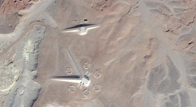 In questa parte del deserto a circa 50 km dalla città del Cairo in Egitto, si può notare questa struttura geometrica alquanto strana. Ovviamente non pensiamo che possa trattarsi di una struttura antica, anche perché nel 2009 questa struttura non era visibile. Quello che colpisce particolarmente, è la forma particolare di questa struttura, che si presenta con un disegno geometrico particolare. A prima vista , questa struttura sembra presentarsi come una base militare, o di un depuratore, o di uno stabilimento, o di qualcosa di archeologico, o alieno? Facendo una ricerca nel web non si trova nessuna informazione inerente a questa struttura, e nessuna notizia in merito. Ma se fosse una base militare, cosa ci fa una base militare isolata in quel posto? Potrebbe anche essere un giacimento di qualcosa minerario, oppure un centro di raccolta di qualcosa che noi non sappiamo. Ci sono 4 ingressi sulla seconda struttura e un ingresso grande sulla prima. La forma di questa struttura , è molto particolare, potrebbe essere anche una base missilistica , oppure una base di origine nucleare. Se c’è qualcuno di voi del campo, e ha il modo di indagare su questa formazione, ci piacerebbe saperne di più. Scrivete pure nei commenti. Grazie.