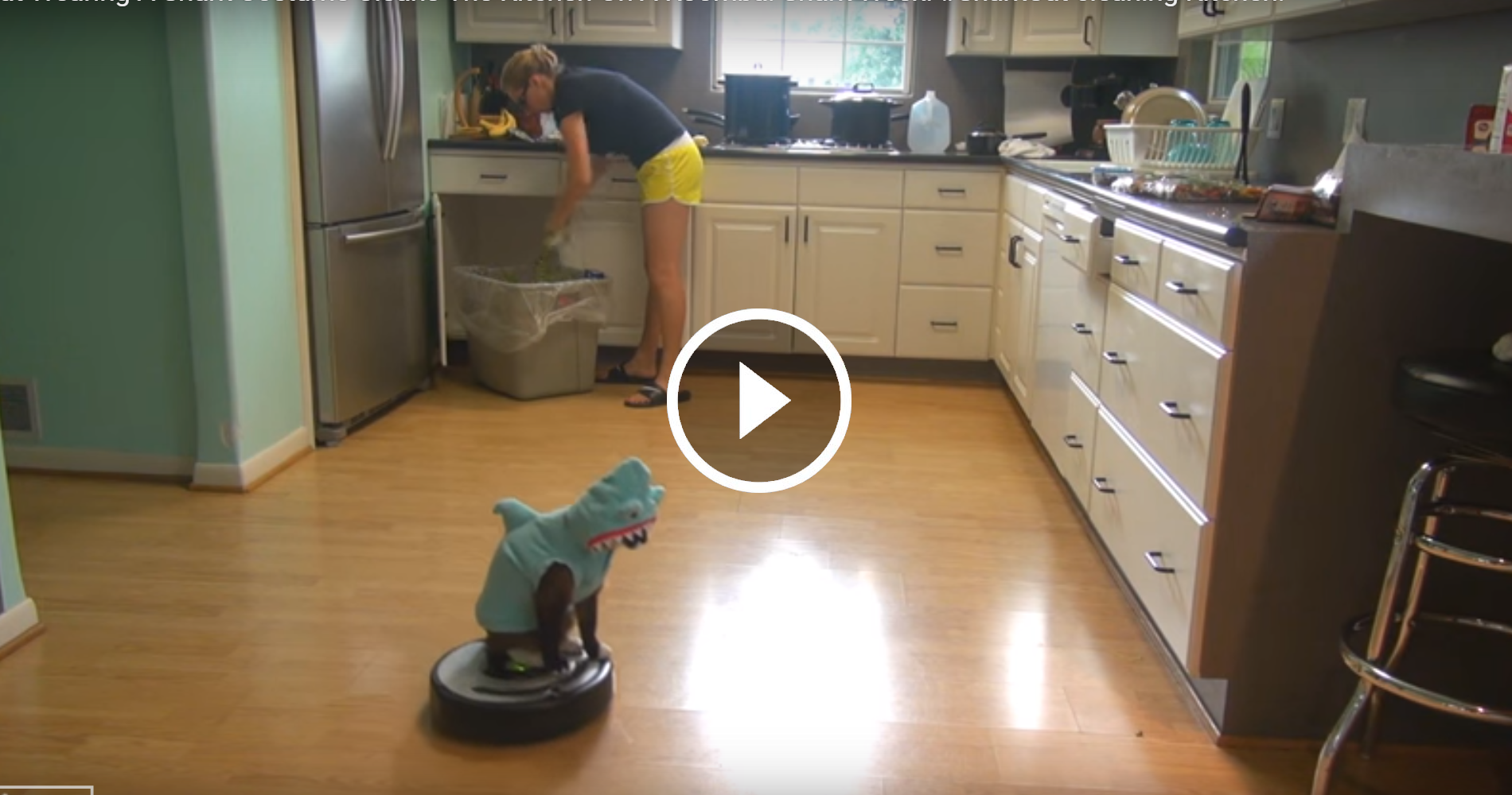 Uno simpaticissimo gatto travestito da squalo fa le pulizie in cucina… Un ottimo uso alternativo del ROBOT ASPIRAPOLVERE