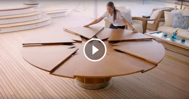 E ‘un tavolo rotondo che, in rotazione a suo perimetro esterno, raddoppia incredibilmente la sua capienza e sorprendentemente, rimane circolare. Può ospitare sei persone quando è piccolo, e dodici o più quando viene ampliato. E’ stato descritto come ‘pura magia’ dalla rivista Boat International, è davvero uno spettacolo da vedere ed estremamente veloce,  solo tre secondi per completare un intero ciclo di espansione o riduzione.